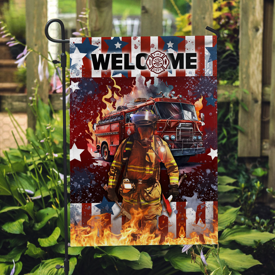 Firefighter Christmas Welcome Garden Flag - American Flag Fire Dept