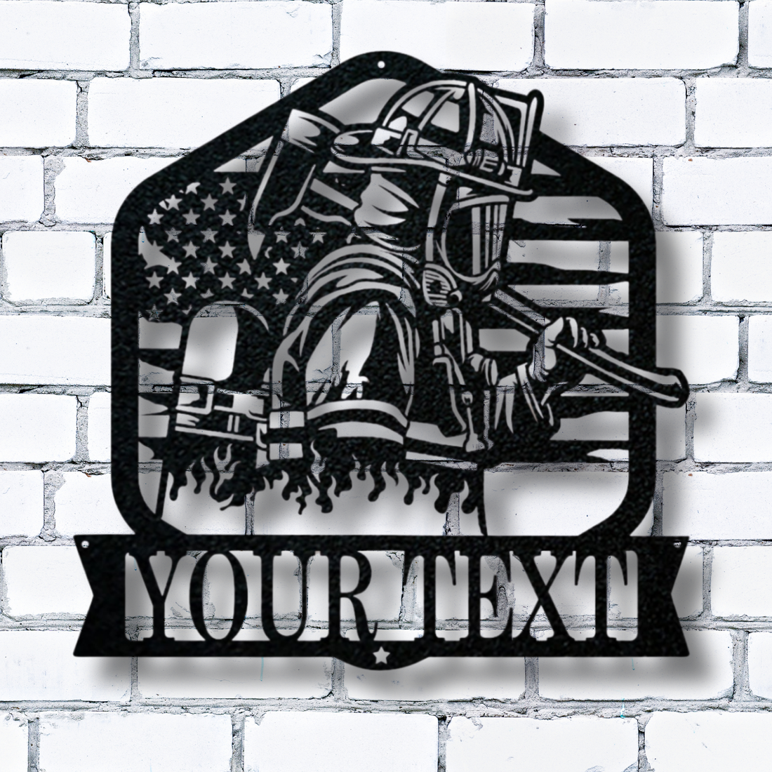 Stehender Feuerwehrmann mit Axt – Individuelles Namensschild aus Metall – Personalisierte Wanddekoration für die Feuerwehr