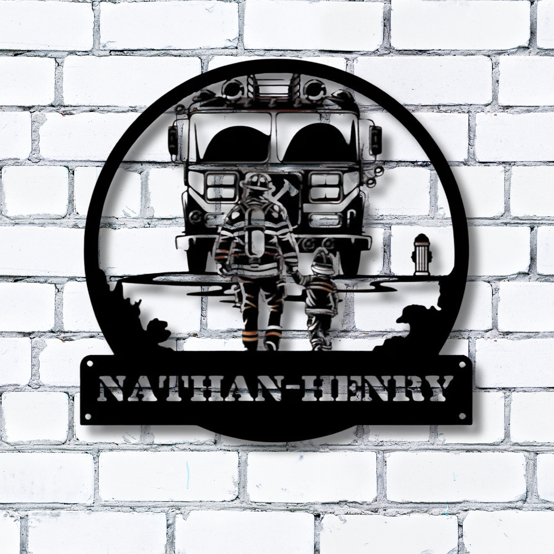 Metallschild mit individuellem Namen „Feuerwehrmann-Papa und sein Kind“ – Personalisierte Wanddekoration