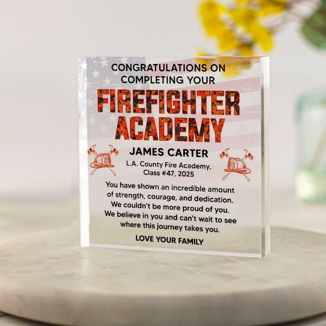 Celebrate fire academy graduation with this personalized acrylic plaque. Featuring "Congratulations on Completing Your Firefighter...