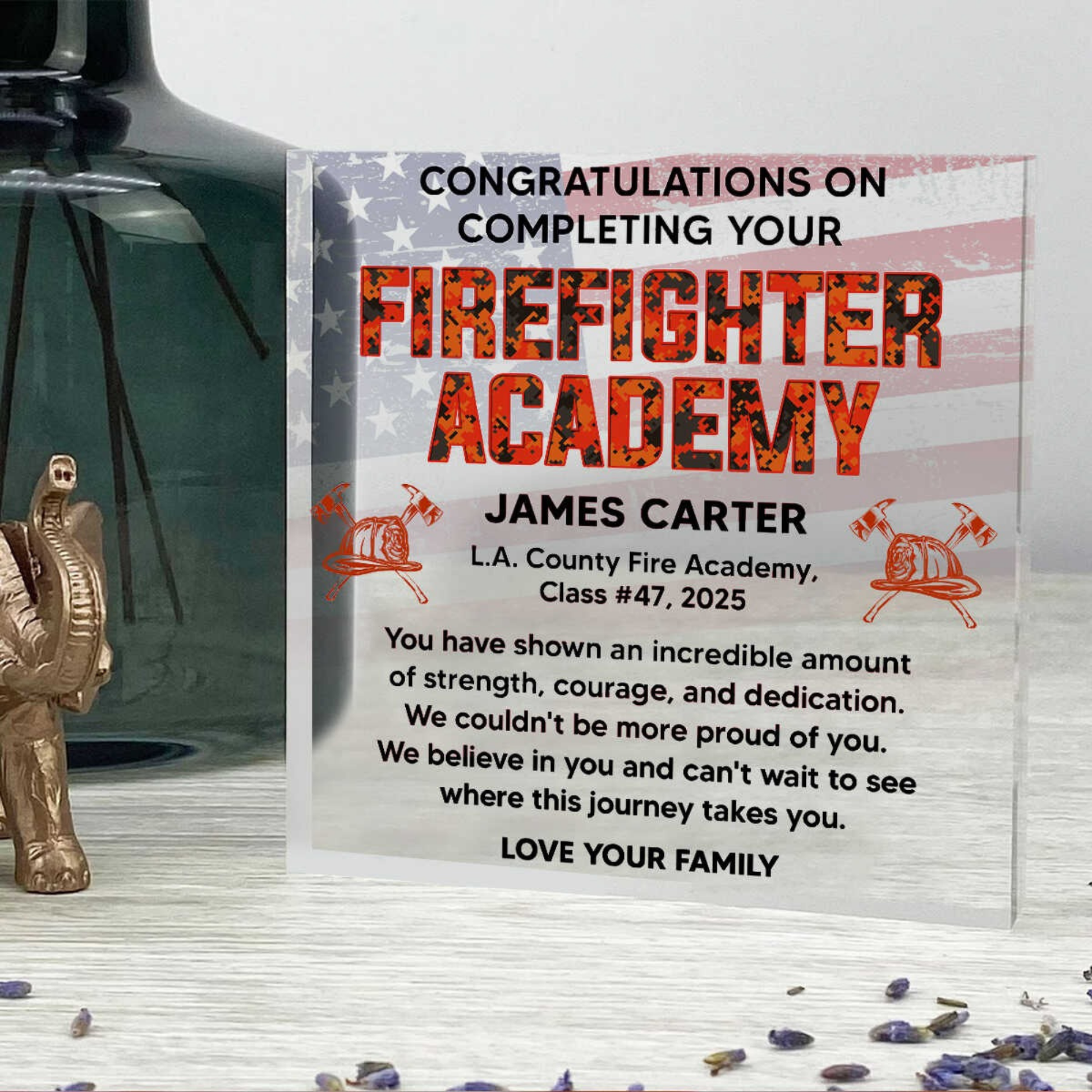 Celebrate fire academy graduation with this personalized acrylic plaque. Featuring "Congratulations on Completing Your Firefighter Academy" message with flame-textured lettering, American flag background, custom graduate name, academy details, heartfelt message, and sender name, this crystal-clear award honors this monumental achievement.