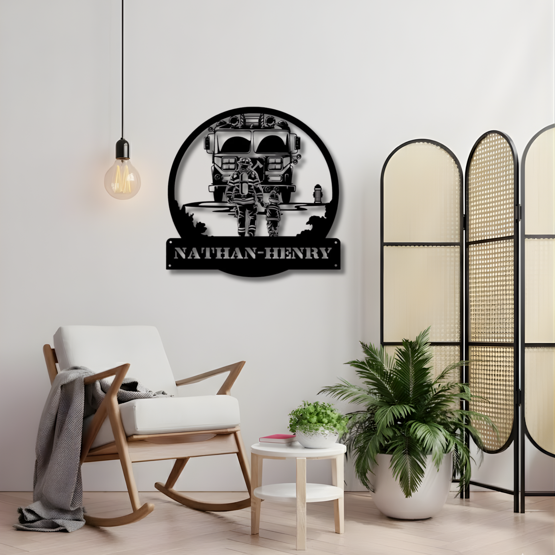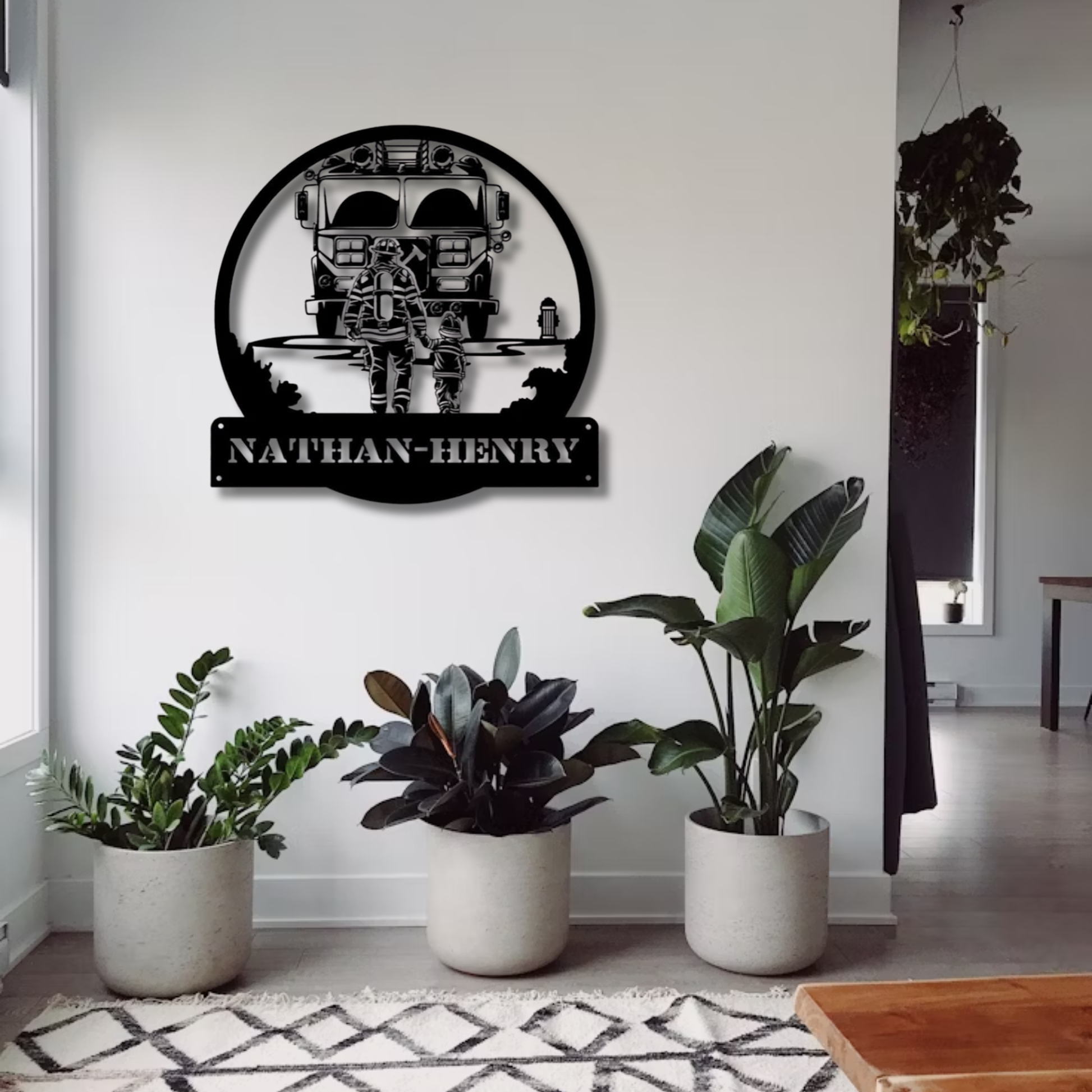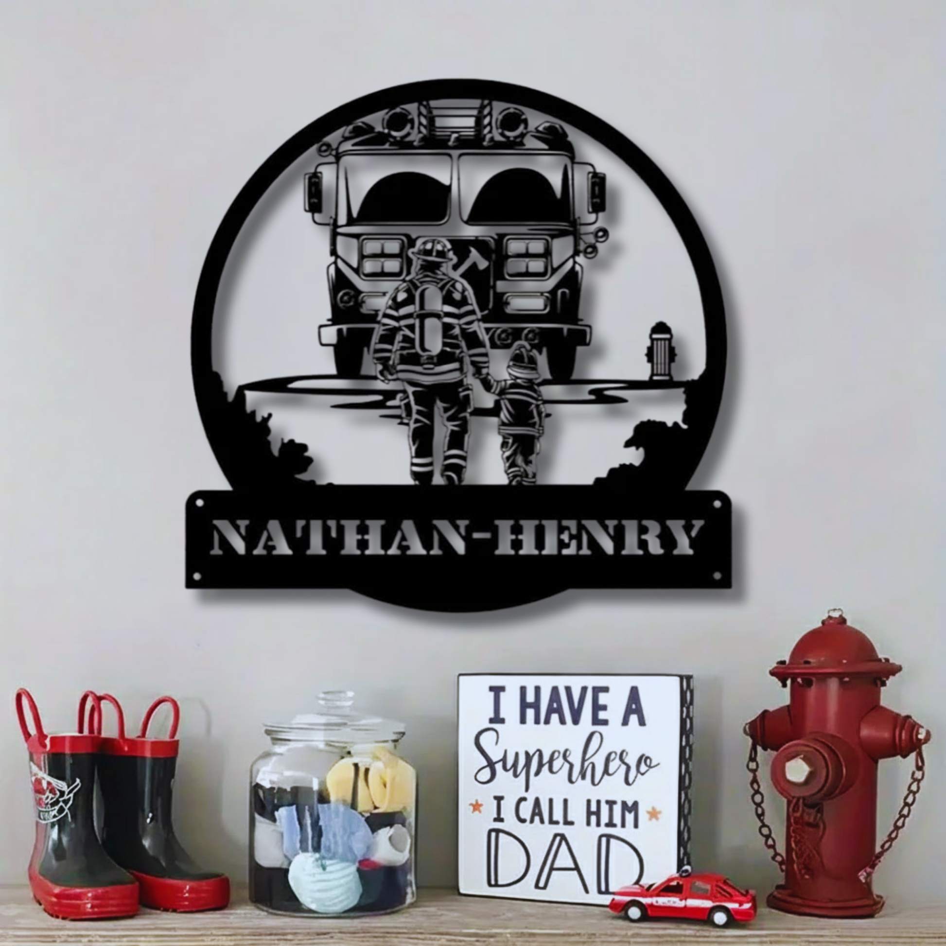 Metallschild mit individuellem Namen „Feuerwehrmann-Papa und sein Kind“ – Personalisierte Wanddekoration