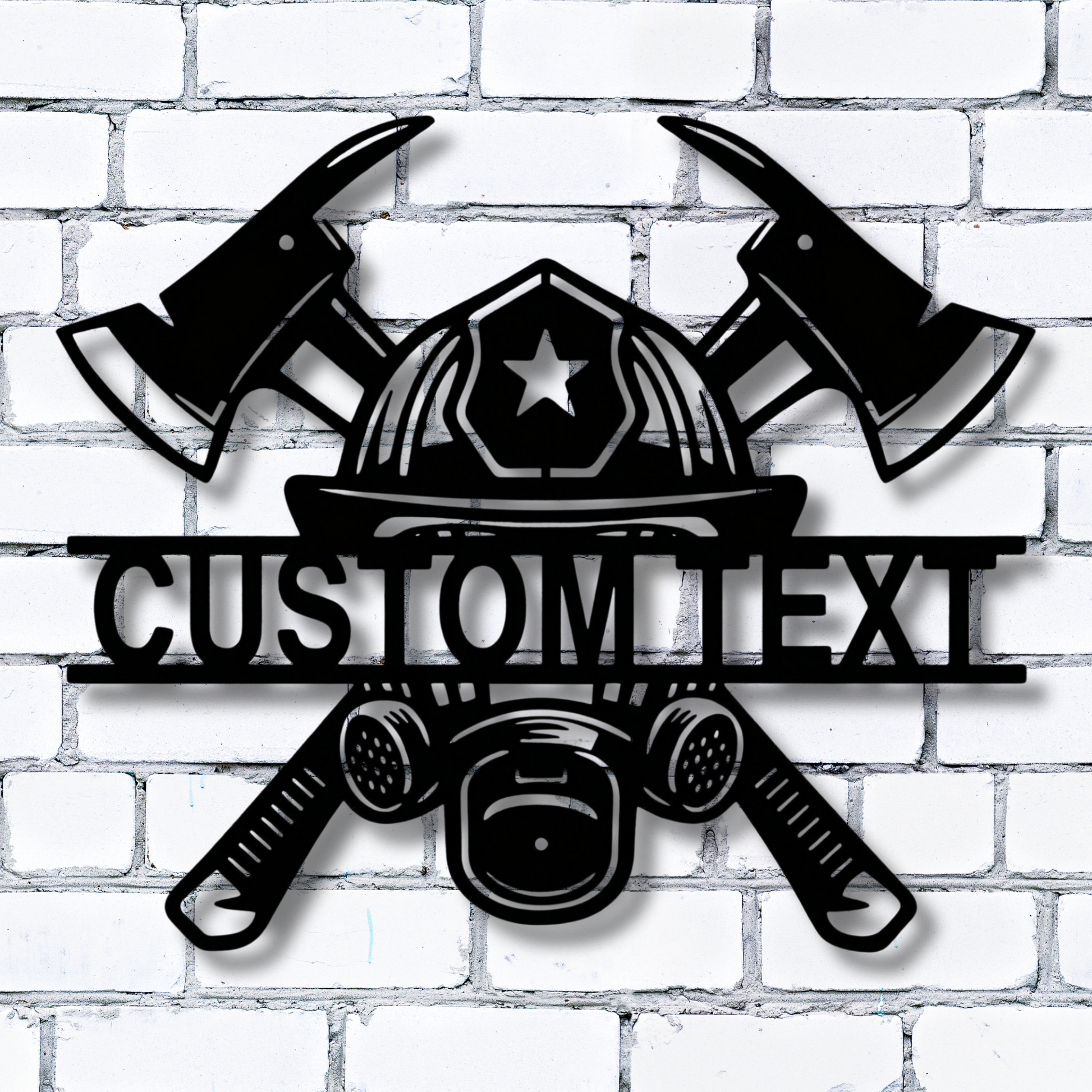 Feuerwehrmaske mit gekreuzten Äxten – Individuelles Namensschild aus Metall – Personalisierte Wanddekoration