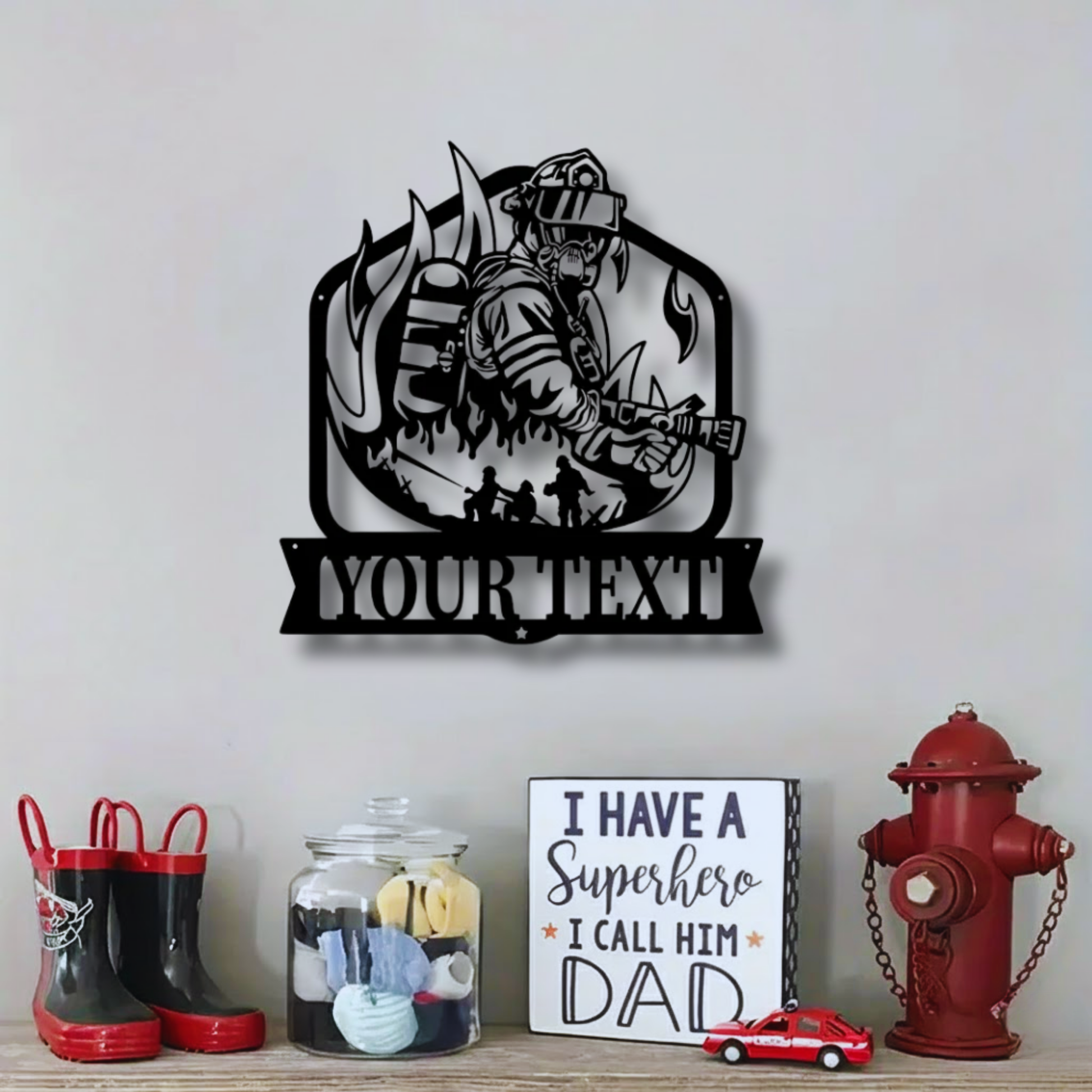 Individuelles Metallschild „Feuerwehrmann mit Schlauch“ – Personalisierte Wanddekoration