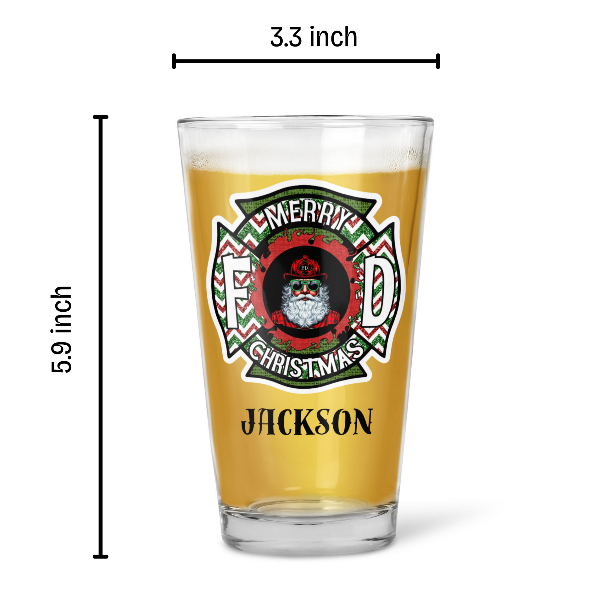 This unique 16oz pint glass combines your love for the fire service with the magic of Christmas. Featuring a badass Firefighter Santa wearing an FD helmet alongside festive holiday designs and YOUR personalized name, this glass is the ultimate way to toast the season.