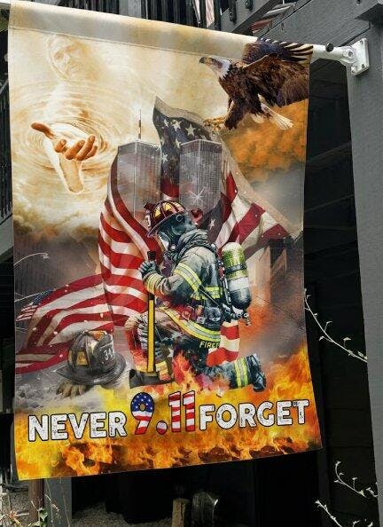 Pay tribute to the heroes of September 11th with this powerful "Never Forget" memorial flag, available in both house flag (28x40) and garden flag (12x18) sizes to perfectly complement your outdoor memorial display.