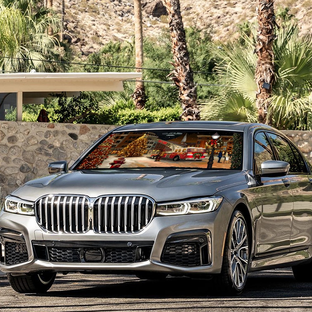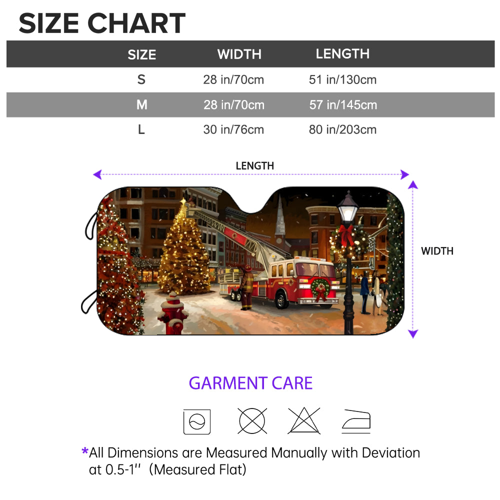 This premium 57.1" x 27.6" dual-layer windshield sunshade features a stunning winter scene with a red fire truck responding to a snowy Christmas town square adorned with illuminated trees, twinkling lights, and holiday decorations, crafted from reflective polyester with aluminum foil bubble plate technology that blocks harmful UV rays and reduces interior heat by up to 35°F, complete with four suction cups for secure installation and foldable design with elastic storage strap, perfect for protecting your vehicle's dashboard and interior while celebrating the holiday season and honoring first responders.