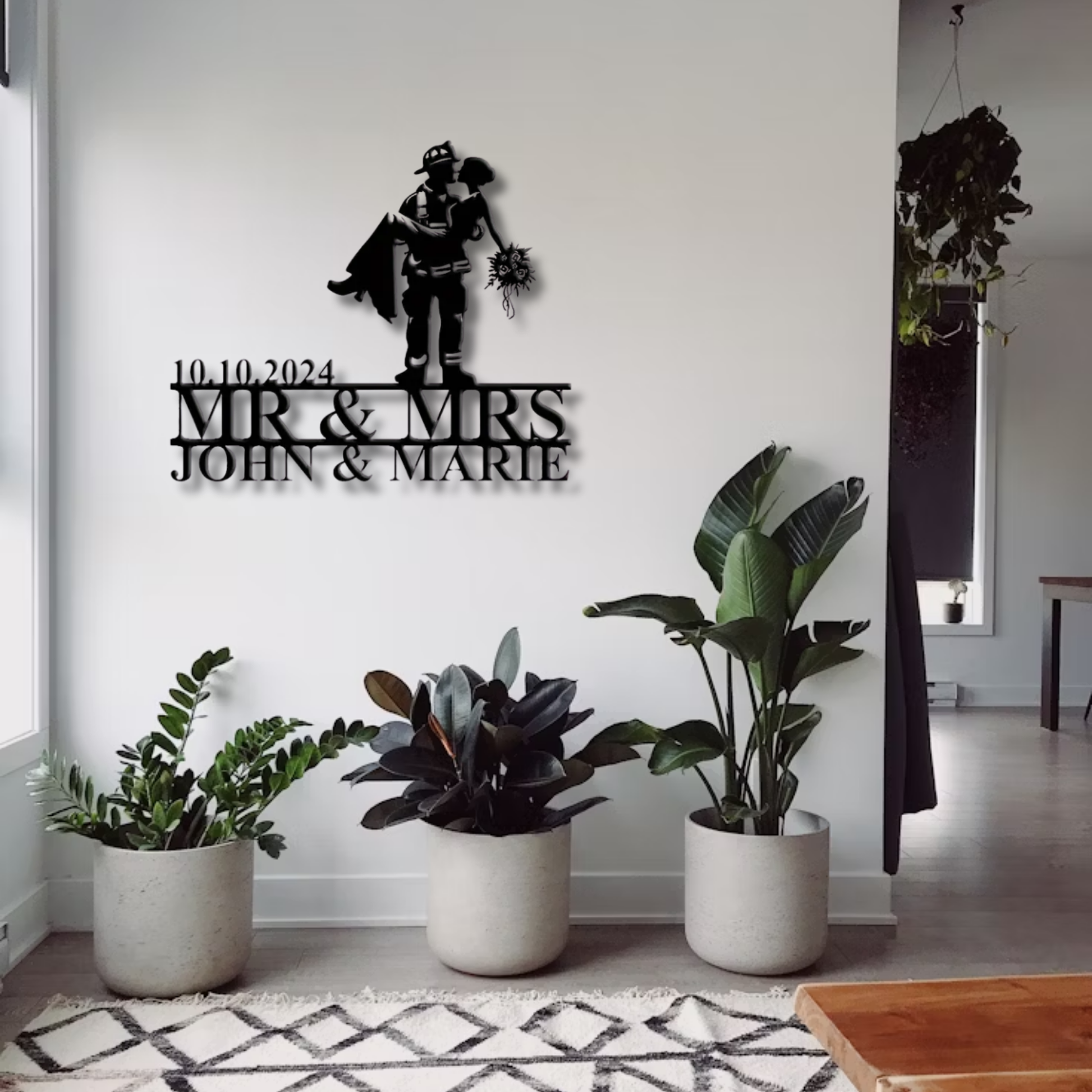 Firefighter Groom Kissing Bride Custom Metal Sign - Personalized Wall Art