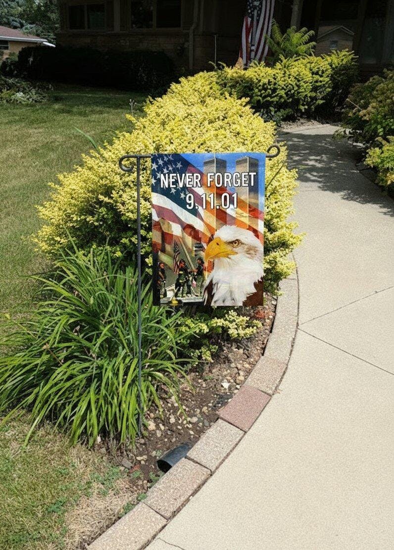 Garden Flag (12x18) - Perfect Memorial Garden Accent: The companion 12x18 garden flag offers an intimate way to remember and honor 9/11 heroes in your garden, yard, or patio area. Meticulously printed using dye sublimation process on high-quality polyester canvas, this memorial flag delivers crisp details and vibrant colors that resist fading through countless seasons of remembrance.